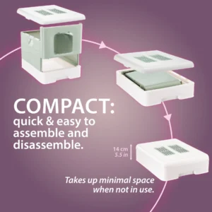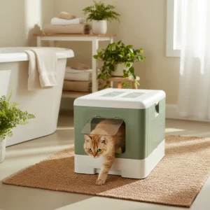 - Covered litter box with swing door for added privacy