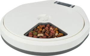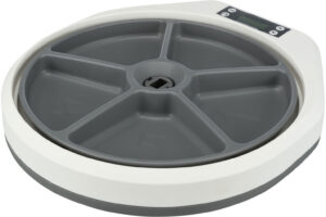 TX5 Automatic Food Dispenser feeding intervals (max. 24 h) for 4 meals can be programmed for 4+1 meals of 240 ml also suitable for wet food feed bowls dishwasher proof battery-operated (4 AA mignon batteries not included) plastic