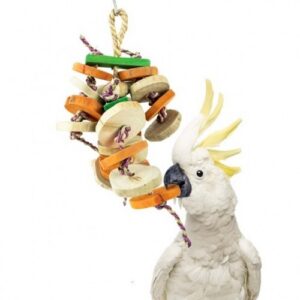 Эта игрушка — надёжная игрушка, изготовленная из высококачественных материалов, таких как дерево Java, верёвка и банановый лист. Из-за твёрдой древесины она очень подходит для попугаев и кроликов.