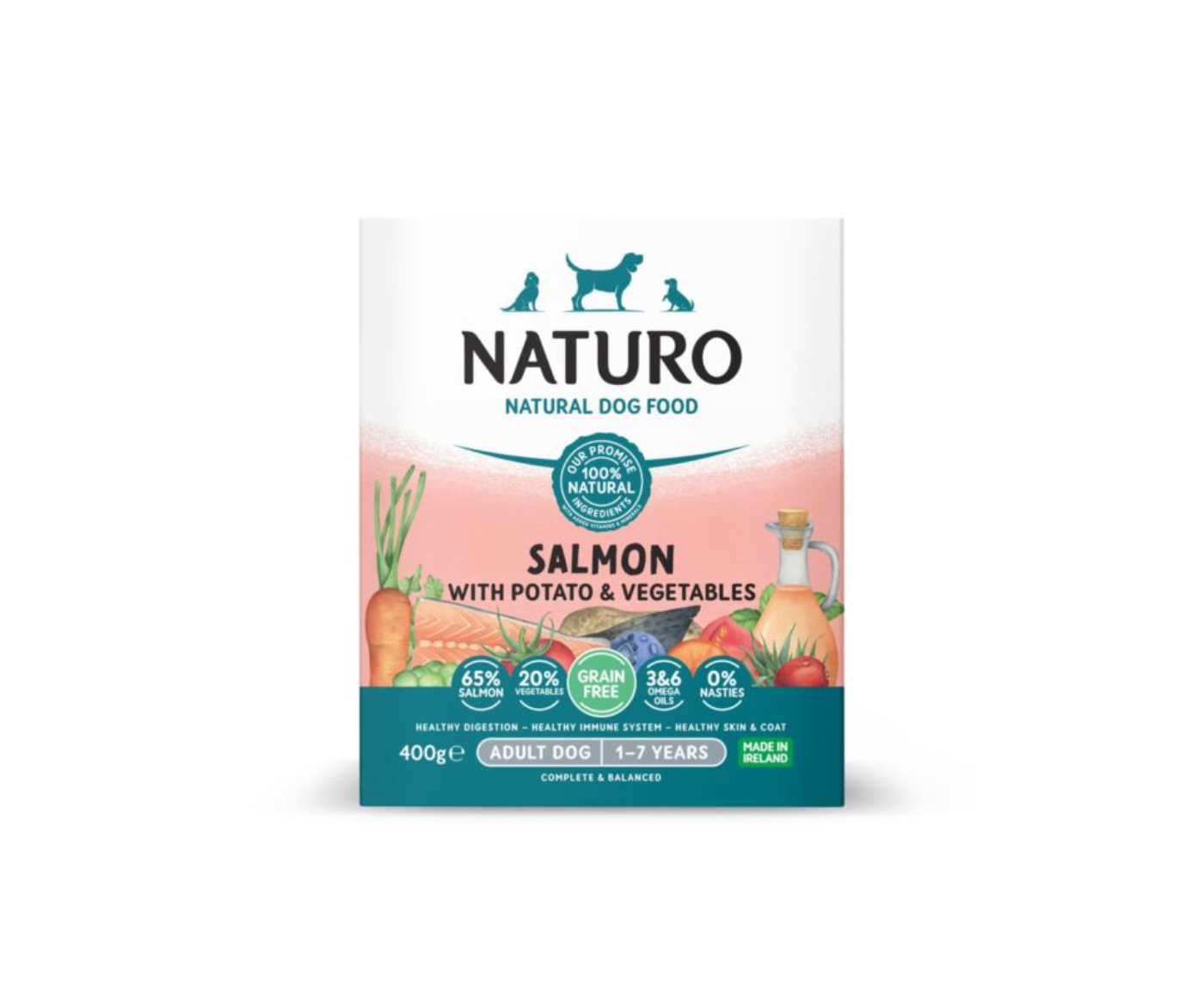 Naturo содержит 100% натуральные ингредиенты с добавлением витаминов, минералов и кальция для поддержки иммунной системы, зубов и костей вашей собаки. Наш рецепт не содержит добавленных искусственных красителей, ароматизаторов или консервантов, обеспечивая лучшую натуральную, гипоаллергенную еду для вашей собаки.