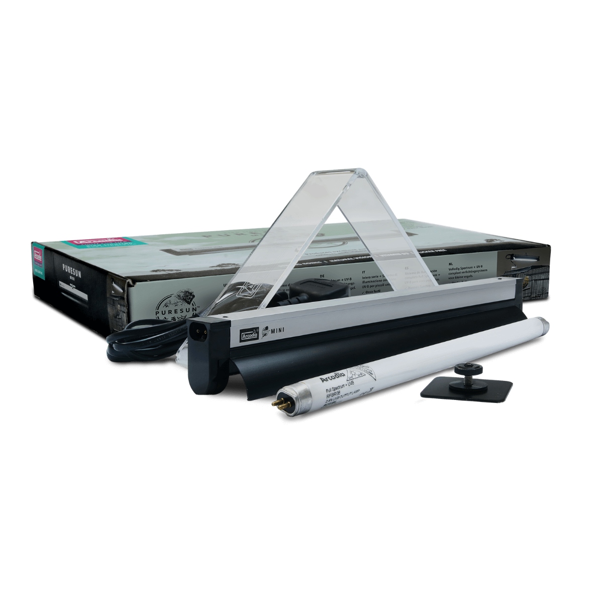 Arcadia Bird ‘PureSun-Mini’ täielik valgustussüsteem on hõlpsasti kasutatav, moodne ja atraktiivne täisspektriga + UV-B komplekt. See atraktiivne komplekt mitte ainult ei aita luua teie kodulindudele loomulikku keskkonda, vaid võimaldab teil neid ka kõige loomulikumal võimalikul viisil jälgida.